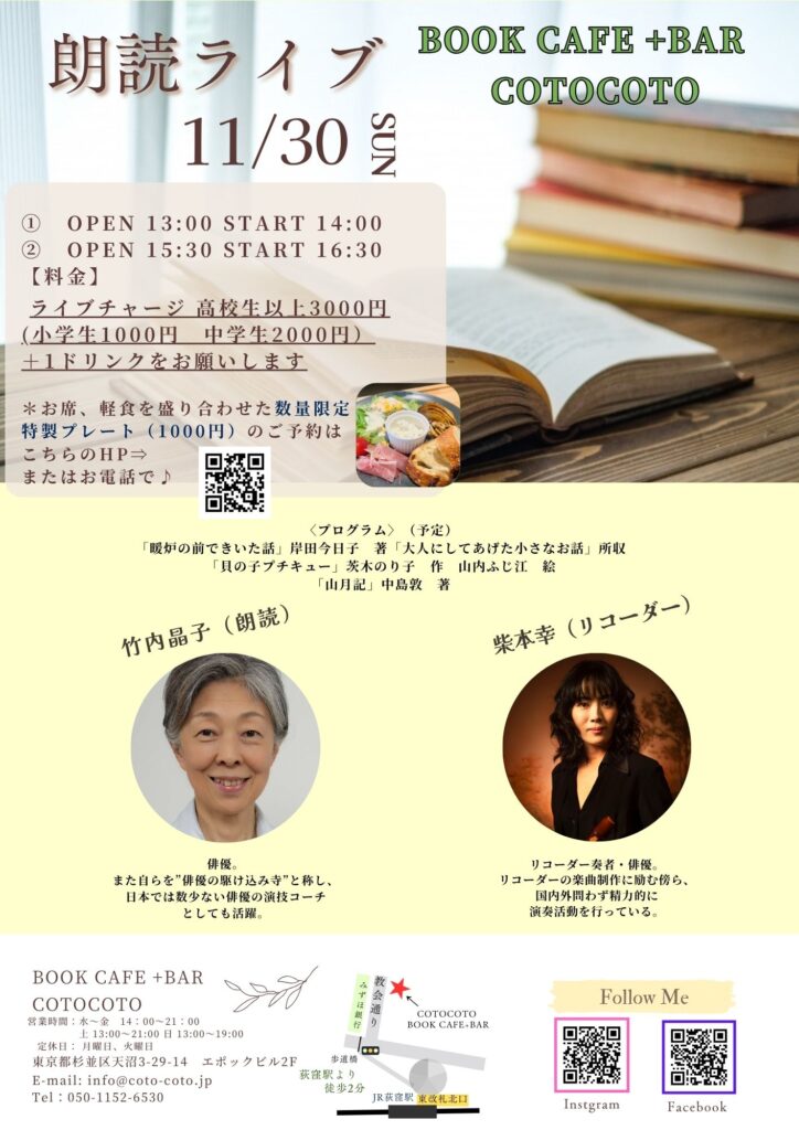 11月30日(日)の朗読ライブは、俳優、演技トレーナー、映画監督として活躍する竹内晶子さんと、俳優の柴俊夫さん、真野響子さんのお嬢様で、リコーダー奏者としても活躍する柴本幸さんによる公演です。